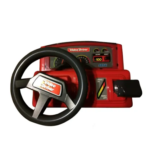 The video driver is a battery-powered plastic steering wheel attached to a bulky sensor. The sensor is meant to then be physically attached to a television, though it only fits comfortably on 13-20-inch 4:3 screens found in the late 80s. It sits in front of the television, "looking" at the screen. Mounted on top of the sensor is a small plastic car, which can be moved left or right across the top of the unit by steering the wheel.