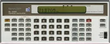 The Sharp EL-5102 is a finance calculator with 12 digits precision and algebraic logic. It has an unknown number of functions, 55 keys and one of the early LCD (liquid crystal) displays which incorporated a yellow filter. The power source is 3xSR44.