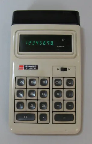 The Sharp EL-806 is an arithmetic calculator with 8 digits precision and algebraic logic. It has 4 functions, 18 keys and a VFD (vacuum fluorescent) display. The power source is 4xAA batteries.