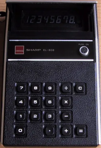 The Sharp EL-808 is an arithmetic calculator with 8 digits precision and algebraic logic. It has 4 functions, 17 keys and an LCD (liquid crystal) display. The power source is 4xAA batteries. The calculator was manufactured in Japan.