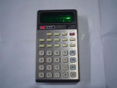 The Sharp EL-8113 ELSIMATE is a scientific calculator with 8 digits precision and algebraic logic. It has 17 functions, 34 keys and a VFD (vacuum fluorescent) display. The power source is 4xAA batteries.
