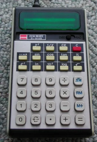 The Sharp EL-8113S ELSIMATE is a scientific calculator with 8 digits precision and algebraic logic. It has 17 functions, 34 keys and a VFD (vacuum fluorescent) display. The power source is 4xAA batteries.