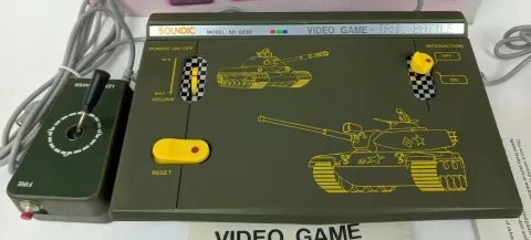 Tank Battle: Model - SD-023C is a dedicated console playing a tank battle game for two players. The console uses the General Instruments AY-3-8700 dedicated chip. Tanks are shown in a top down view and controlled with a joystick. Players must try to fire at each other, but shots are blocked by obstacles in the environment.