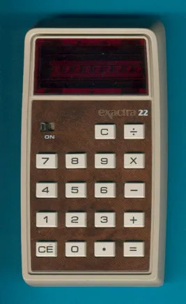 The Texas Instruments exactra 22 is an arithmetic calculator with 8 digits precision and algebraic logic. It has 4 functions, 18 keys and an LED (light-emitting diode) display, typical of calculators of this era. The power source is 3xAA batteries. The calculator was manufactured in USA.