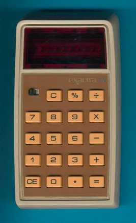 The Exactra 23 could be called the fully loaded model in the cheap Exactra line. It sports an 8-digit display, a %-key and a connector for an external power supply. This position in the Exactra line is demonstrated to the customer with a valuable golden line around the keyboard.