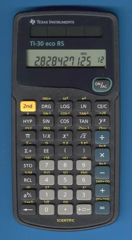 The Texas Instruments TI-30 eco RS is a scientific calculator with 10 digits precision and algebraic logic. It has an unknown number of functions, 40 keys and an LCD (liquid crystal) display. The power source is Solar. The calculator was manufactured in China.