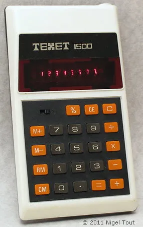 The Texet 1500 is an arithmetic calculator with unknown digits precision and algebraic logic. It has an unknown number of functions, unknown keys and an LED (light-emitting diode) display, typical of calculators of this era. The power source is PP3 9V.
