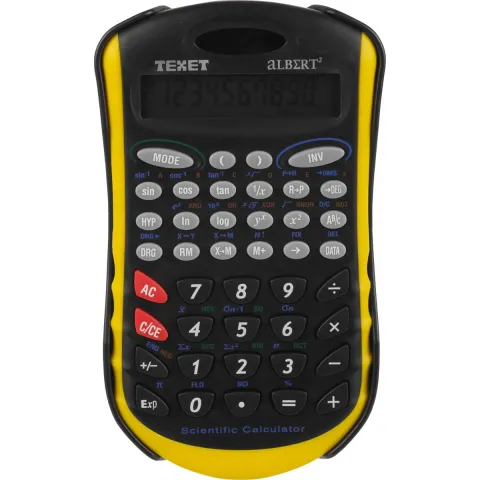 Texet Scientific Calculator in assorted colours. 10 + 2 digit display. Dual powered. Auto power off. Protective cover. Assorted colours 2 x yellow trim, 2 x blue trim, 2 x red trim.