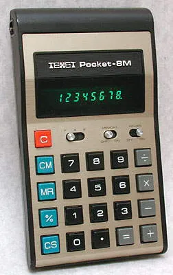 The Texet Pocket-8M is an arithmetic calculator with unknown digits precision and algebraic logic. It has an unknown number of functions, unknown keys and an LED (light-emitting diode) display, typical of calculators of this era.