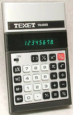 The Texet TRADER is an arithmetic calculator with 8 digits precision and algebraic logic. It has 12 functions, 28 keys and an LED (light-emitting diode) display, typical of calculators of this era. The power source is 2xAA batteries. The calculator was manufactured in Japan.