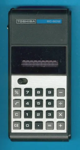 The Toshiba BC-8012 is an arithmetic calculator with 8 digits precision and algebraic logic. It has 6 functions, 20 keys and a VFD (vacuum fluorescent) display.