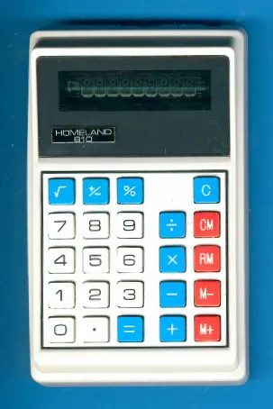 The Homeland 810 is an arithmetic calculator with 8 digits precision and algebraic logic. It has 7 functions, 24 keys and a VFD (vacuum fluorescent) display. The power source is 4xAA batteries.