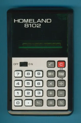 This Homeland 8102 is a typical Japanese calculator using a green VF-Display (Vacuum Fluorescent Display), a solid keyboard and a somewhat boring styling.