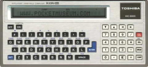 A handheld computer, the IHC-8000 was Toshiba's entry into that once promising market of HHCs, or Hand Held Computers. On its bezel, the IHC-8000 is proudly described as an "intelligent hand-held computer", and it is indeed more intelligent than most HHCs of its era: for one thing, it has a decent BASIC interpreter built-in. For another, it does not use those dreaded NiCd internal batteries that make so little sense for a low-power CMOS device.