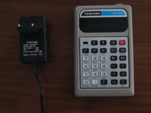 The Toshiba SC-6100 is a scientific calculator with 8 digits precision and algebraic logic. It has 26 functions, 29 keys and a VFD (vacuum fluorescent) display. The power source is 4xAA batteries.