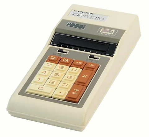 The Model 85 "Tallymate" from 1972 is a basic four-function calculator in a portable battery-powered case. (It is much too large to be considered a "pocket" calculator). The name pays tribute to the earlier mechanical "Tallymaster" machines, and the name badge carries the Victor Comptometer "VC" logo.