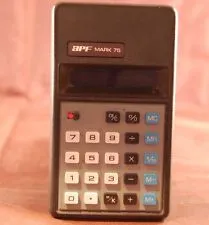 The APF MARK 75 is an arithmetic calculator with 8 digits precision and algebraic logic. It has 5 functions, 23 keys and an LED (light-emitting diode) display, typical of calculators of this era.