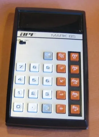 The APF MARK 85 is an arithmetic calculator with 8 digits precision and algebraic logic. It has 5 functions, 23 keys and a VFD (vacuum fluorescent) display. The power source is 3xAAA batteries.