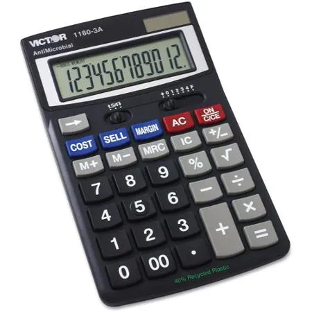 12 digit business calculator is perfect for the home or office. Features an extra large, easy to read angled LCD display. This calculator is engineered with an AntiMicrobial agent to reduce the growth of microbes and bacteria that can cause discoloration and odors.