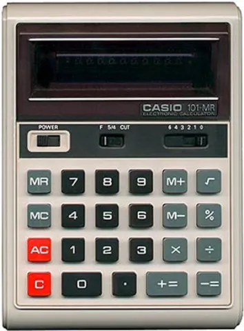 The Casio 101-MR is an arithmetic calculator with 10 digits precision and algebraic logic. It has 6 functions, 23 keys and a VFD (vacuum fluorescent) display. The power source is 4xAA batteries. The calculator was manufactured in Japan.