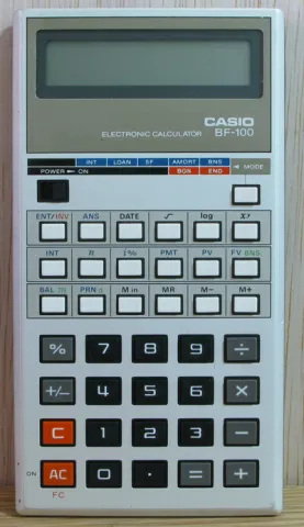 The Casio BF-100 is a finance calculator with 10 digits precision and algebraic logic. It has an unknown number of functions, 39 keys and an LCD (liquid crystal) display. The power source is 3V cell.