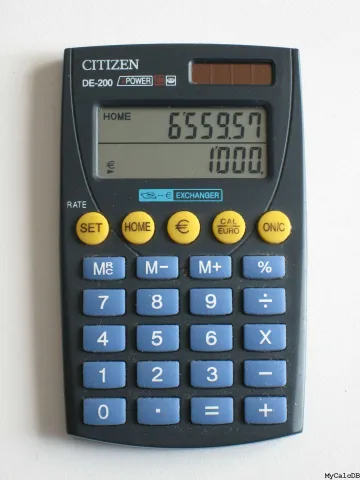 The Citizen DE-200 EXCHANGER is an arithmetic calculator with 8 digits precision and algebraic logic. It has 5 functions, 25 keys and an LCD (liquid crystal) display. The most important function is "on-the-fly" conversion between euros and local currency.