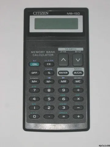 The Citizen MB-150 MB-150/155 is an arithmetic calculator with 8 digits precision and algebraic logic. It has an unknown number of functions, 28 keys and an LCD (liquid crystal) display. The power source is CR2016 3V. The calculator was manufactured in Taiwan.