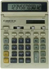 The Canon BS-121 is an arithmetic calculator with 12 digits precision and algebraic logic. It has 11 functions, 30 keys and an LCD (liquid crystal) display.