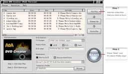 AoA DVD Creator provides you a handy tool to convert and burn AVI/DivX/XviD, WMV/ASF, MP4, FLV, 3GP, MPEG-1/MPEG-2, DAT, and MOV into DVDs that you can watch in your home DVD player. With AoA DVD Creator, you can easily turn the vacation, wedding, and family movies into DVDs that you can burn and share with your friends and family. Easily create DVDs in your own home. Drag and drop video files into the program, click Start and it's done.