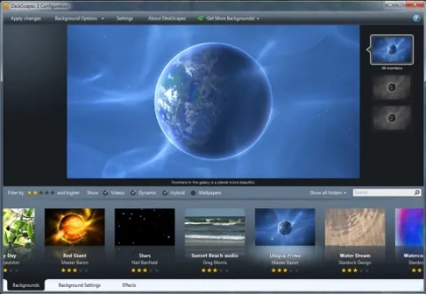 DeskScapes turbo-charges the windows desktop by adding support for animated wallpapers as well as providing a range of real-time effects for users existing desktop backgrounds. It makes use of the hardware acceleration of modern video cards to enable these effects without it slowing down your computer.