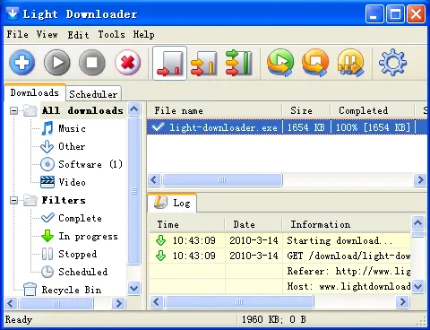 Light Downloader is a free download manager that accelerates your downloads by splitting the files into several parts and downloading them simultaneously. As a result download speed increases up to 6 times, or even more! Light Downloader can resume broken download from where it was interrupted. Light Downloader supports FTP, HTTP and HTTPS. Proxy is also supported.