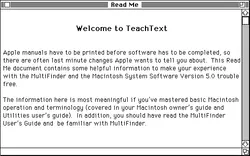 The TeachText application is a simple text editor made by Apple Computer bundled with System 7.1 and earlier. It was created by Apple programmer Bryan Stearns with later versions created by Stearns and Francis Stanbach. TeachText was one of the only applications included with the Mac system software, leading to its most frequent role as the application to open "ReadMe" files. It was named "TeachText" as a nod to its role in tutorials and other introductory materials. TeachText was derived from the Edit application, and later evolved into SimpleText.
