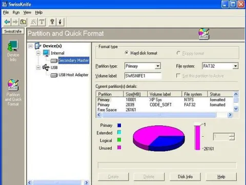 If you are looking for an external hard disk drive that can be used interchangeably between Windows XP, Windows 98, Mac OS, and Linux, there is only one way to prepare the hard disk and SwissKnife does it for you. You can create, delete partitions and format your IDE hard disk drives in one smooth, simple process.