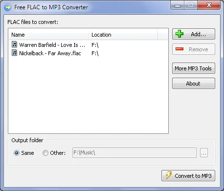 Free FLAC to MP3 Converter offers an easy way to convert all your FLAC audio files to MP3. The program's interface is very simple. Just add the files you want to convert to the list (you can drag and drop them directly from Windows Explorer), select the output folder, and then click the convert button.