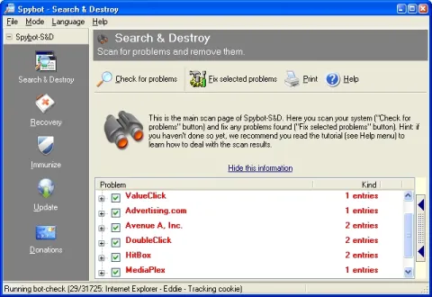 Spybot - Search & Destroy can detect and remove a multitude of adware files and modules from your computer. Spybot also can clean program and Web-usage tracks from your system, which is especially useful if you share your computer. Modules chosen for removal can be sent directly to the included file shredder, ensuring complete elimination from your system. For advanced users, it allows you to fix Registry inconsistencies related to adware and to malicious program installations. The handy online-update feature ensures that Spybot always has the most current and complete listings of adware, dialers, and other uninvited system residents.