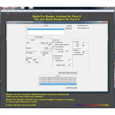 Batch Pro Render Assistant for Poser 8 is a plug-in that allows the user to render multiple Poser files automatically. With all the long hours you put into your projects there is still a large number of hours that may be thrown away each day while you eat, sleep, or just tend to your daily life that doesn't involve 3D projects. With Batch Pro Render Assistant you can set up multiple scenes with different camera angles, lights, renders settings, etc. and render them while you are away from your computer thereby increasing productivity and regaining hours of lost opportunity.