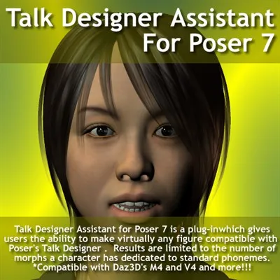 Talk Designer Assistant for Poser 7 is a plug-in which gives users the ability to make virtually any figure compatible with Poser's Talk Designer. Results are limited to the number of morphs a character has dedicated to standard phonemes.