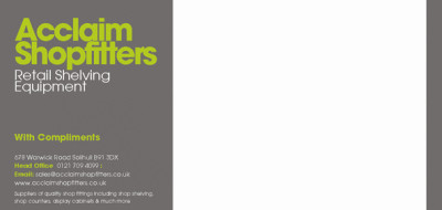 Suppliers of quality shop fittings including shop shelving, shop counters, display cabinets & much more. We truly believe that we offer the best value new shop shelving & Shop Fitting in the UK and Ireland contact sales for helpful advise on all things retail, Express Next Day Delivery on all shop shelving orders with top brands like Tegometall and AMX35 in stock. At Acclaim Shopfitters we believe that when it comes to ordering your retail shop shelving, shop counters and shop fitting work, the 4 key factors affecting your buying decision are Price - We Guarantee to beat any genuine Tegometall & Amx35 quotes on a like for like basics. Quality- We beat the rest, please call to arrange free shelving samples. Service - We Promise to go that extra mile, If you have a problem we truly want to help Lead Time - Nationwide next day delivery and 1000’s of shelving bays and gondola units in stock. Since we were first established in 2002 we have gained a much respected reputation throughout the UK due to our dedication to providing quality workmanship with all our projects. Our strong focus on customer service when Shopfitting has also helped establish our strong reputation. We only use quality assured manufacturers and fully certified plumbers and electricians on our projects so you can be guaranteed of quality workmanship and professionalism every time. We provide our shop fitting services to all types of clients both big and small throughout the UK. Acclaim Retail Services can guide you through your project whether that is a single bay of racking or a complete branch refit. With 10 years of trading and FREE CAD & store layout advice - why pay for expensive consultants when Acclaim will do the job for free?
