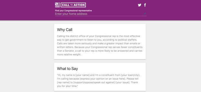 With a simple user interface that’s accessible via the desktop or mobile web, Call To Action has a singular purpose: it makes it easy to find your representatives and place a phone call to their office. It even provides simple scripts to help users get started. However, Call To Action doesn’t currently take a political position, nor is it associated with any political action groups. As evidenced by its purple color scheme, its main goal is to simply make reaching out to users' House representatives more accessible. When users launch the Call To Action website, they are prompted to enter in their home address, and the app will then locate their Congressional representative. As the website explains, because Congressional representatives serve fewer constituents than a Senator, calls to representatives are more likely to be answered and hold more relative weight. These calls can make a difference – staffers write down constituents' opinions, and this information is tracked by their office.