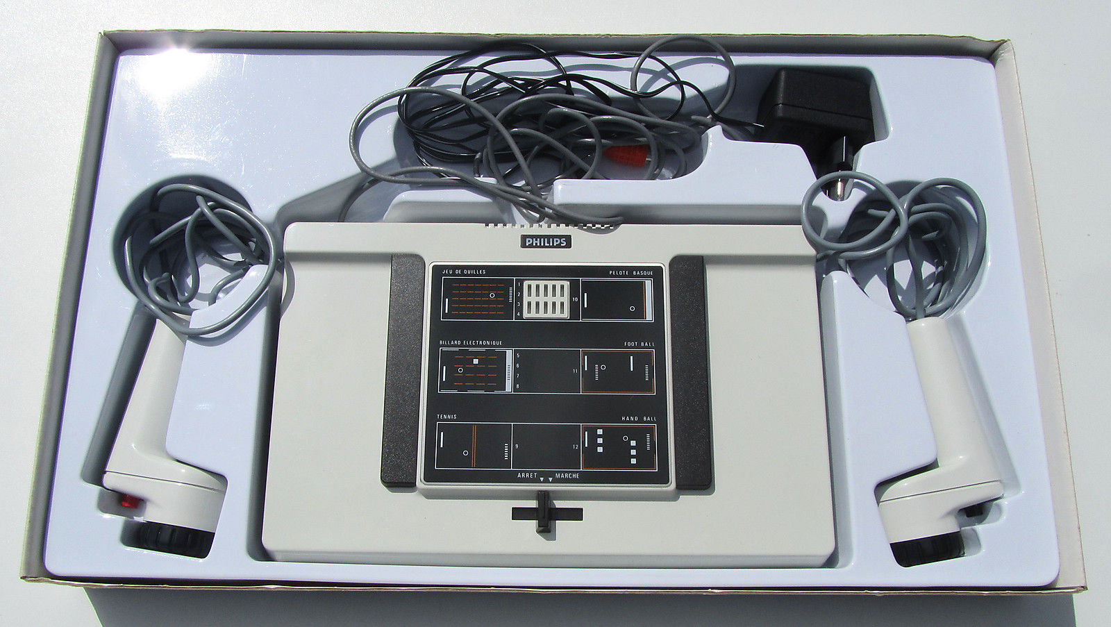 White and black console with two removable joysticks, 1 rotating button and 1 push button to select the game.