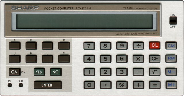 The Sharp PC-1253H is a programmable calculator with 12 digits precision and formula input logic. It has an unknown number of functions, 38 keys and an LCD (liquid crystal) display. The power source is 2xCR2032 3V.