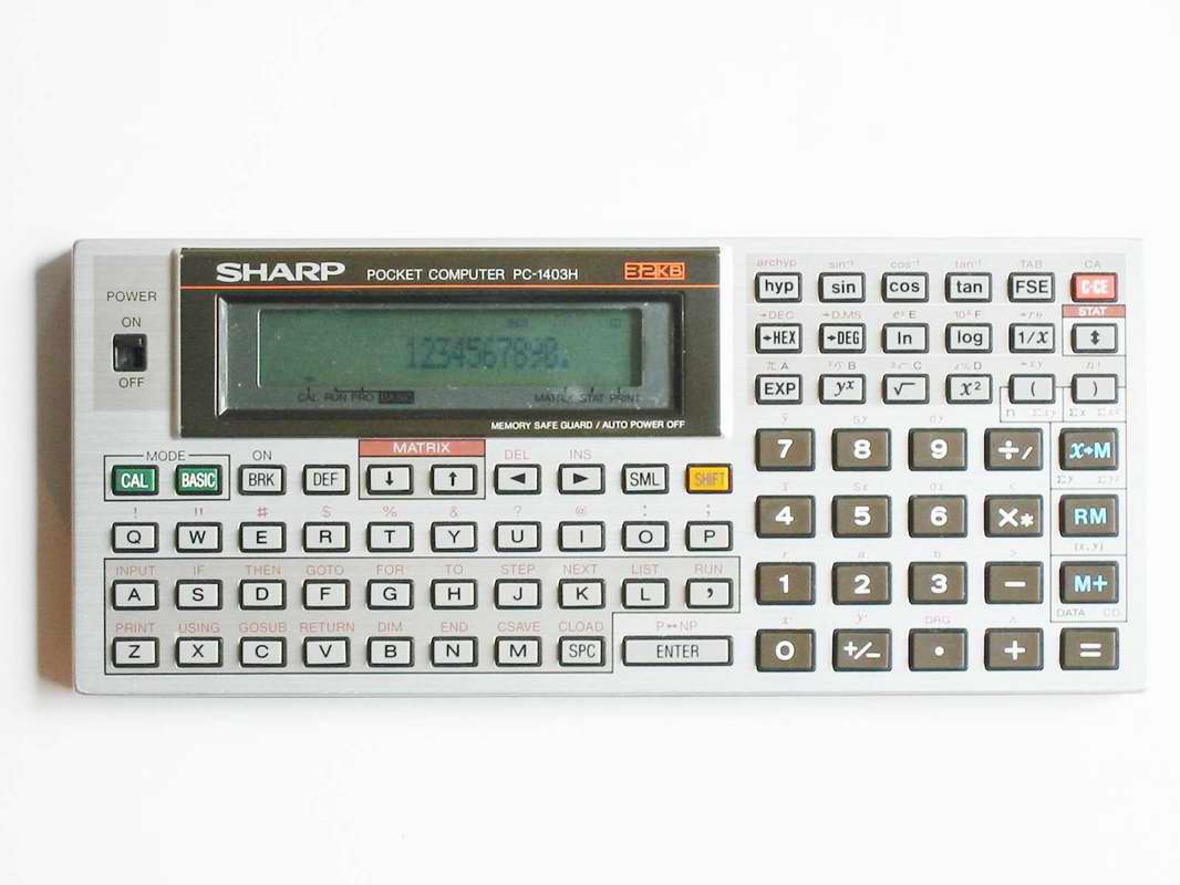 The Sharp PC-1403H is a programmable calculator with 12 digits precision and formula input logic. It has an unknown number of functions, 77 keys and an LCD (liquid crystal) display. The power source is 2xCR2032 3V.