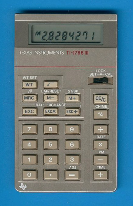 The Texas Instruments TI-1788 III is an arithmetic calculator with 8 digits precision and algebraic logic. It has 6 functions, 26 keys and an LCD (liquid crystal) display. The power source is 2xLR43. The calculator was manufactured in Taiwan.