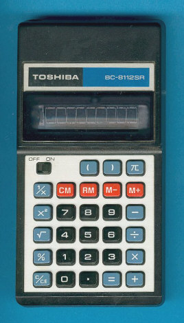 The Toshiba BC-8112SR is an arithmetic calculator with 8 digits precision and algebraic logic. It has 11 functions, 28 keys and a VFD (vacuum fluorescent) display. The power source is 2xAA batteries.