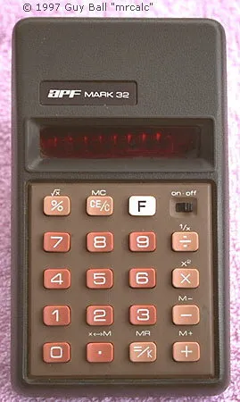 The APF MARK 32 is an arithmetic calculator with 8 digits precision and algebraic logic. It has 8 functions, 19 keys and an LED (light-emitting diode) display, typical of calculators of this era. The power source is PP3 9V.
