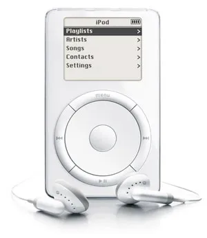 Apple introduced the first-generation iPod on October 23, 2001, with the slogan "1,000 songs in your pocket". The first iPod had a black and white LCD (liquid-crystal display) screen and featured a 5 GB hard drive capable of storing 1,000 songs encoded using MP3 and was priced at US$399. Among the iPod's innovations were its small size, achieved using a 1.8" hard drive, whereas its competitors were using 2.5" hard drives at the time, and its easy-to-use navigation, which was controlled using a mechanical scroll wheel (unlike later iPods, which had touch-sensitive scroll wheels), a center select button, and four auxiliary buttons around the wheel. The iPod had a rated battery life of ten hours.