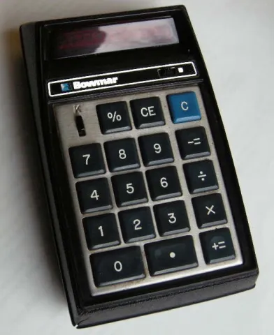 Bowmar MX80 aka 90152, 4-funct, mem, 10 digit red LED, sealed batt, 3.0x5.25", Klixon keypad, looks like MX70, 1973.