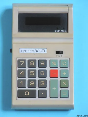 The Citizen 800R is an arithmetic calculator with 8 digits precision and algebraic logic. It has 5 functions, 18 keys and a VFD (vacuum fluorescent) display. The power source is 4xAA sealed.