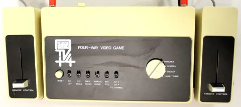 TV+4 Four-Way Video Game is a dedicated console playing four Pong variants. The console uses the AY-3-8500 dedicated pong chip and implements only the paddle and ball games: Practice, Squash, Soccer, Table Tennis. Settings allow for automatic serve, deflection angle, bat size and ball speed. The controllers feature sliders.