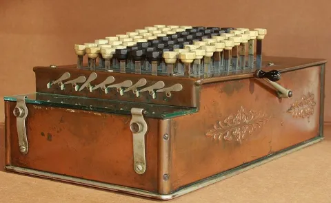 The model A has a polished glass panel for the output display in the front. This model is produced from 1904 to 1906.